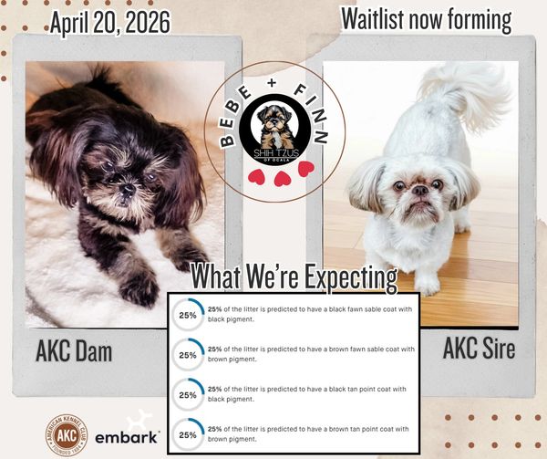 Our breeding process as local Shih Tzu breeders is carefully designed to ensure the health and well-being of our dogs. We conduct full Embark panels for genetic testing to guarantee that our Shih Tzu puppies for sale in Florida are free of any hereditary diseases or conditions. We select our sires and dams for their exceptional temperament and color, ensuring they are all AKC registered. Additionally, we provide our dogs with the best possible care, including proper vetting, nutrition, exercise, and socialization, to prepare them for loving homes.